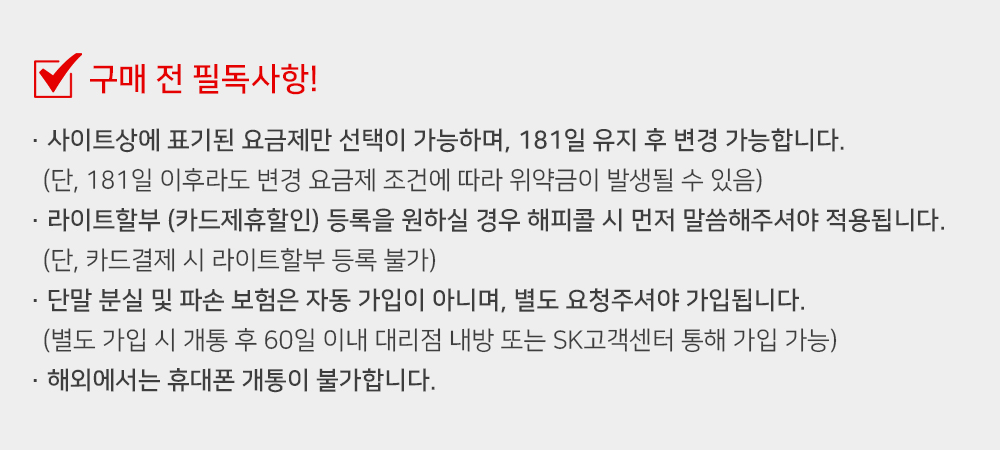 1. 단말기개봉시 개통전이라도 반품이 불가능 합니다. (단말기는 미개봉상태로 배송됩니다)